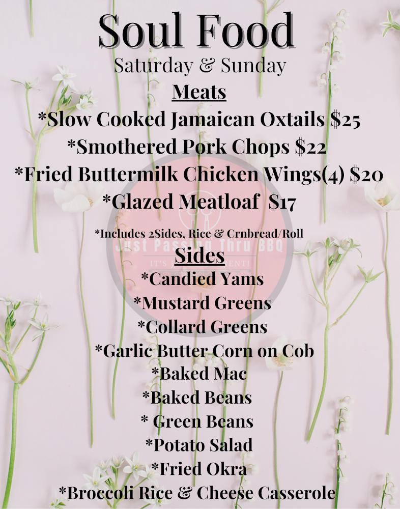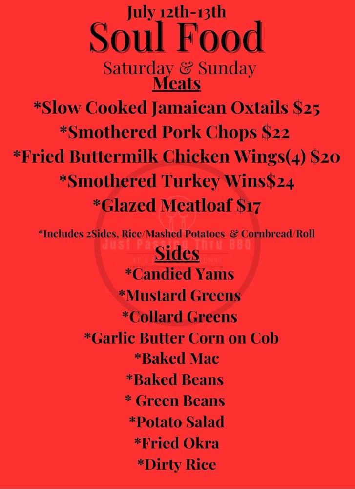 The menu at Just Passing Thru BBQ is a delightful mix of traditional soul food and grilled specialties. Diners will find a variety of meats, including brisket, chicken, and ribs, each smoked to perfection. Unique offerings like boudin and loaded spuds shine as well. Sides like collard greens and potato salad complement the main dishes nicely. The dessert selection features treats that evoke nostalgia, including cobbler and cheesecake. Daily specials keep the menu fresh and enticing, encouraging frequent visits to explore new flavors. Overall, the menu captures the essence of southern hospitality and brings comfort food to life.