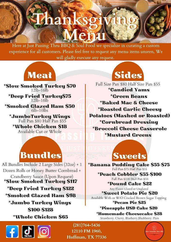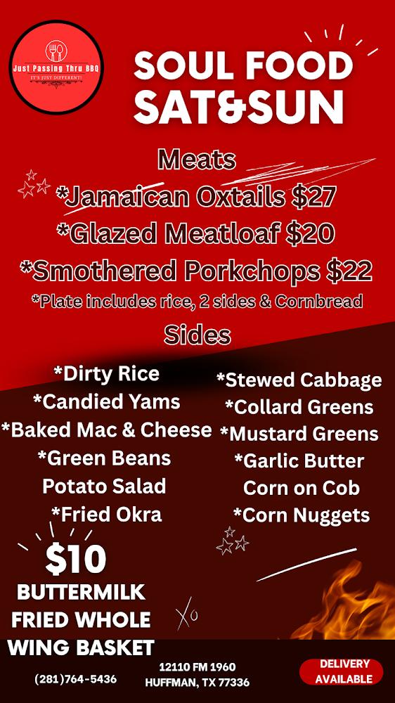 Welcome to Just Passing Thru BBQ, your go-to destination for mouthwatering grilled delights and authentic Afro-American specialties in Huffman, TX. Our cozy restaurant offers a relaxed ambiance, perfect for families, groups, or solo diners. Indulge in our delicious breakfast, lunch, and dinner options, all made with love and local ingredients. Enjoy outdoor seating, convenient drive-thru, and contactless delivery services. We proudly identify as a Black-owned establishment, ensuring a welcoming atmosphere for everyone. From hearty portions to tasty shareables, savor the taste of tradition at affordable prices. Visit us today and experience the warmth of good food and great company!